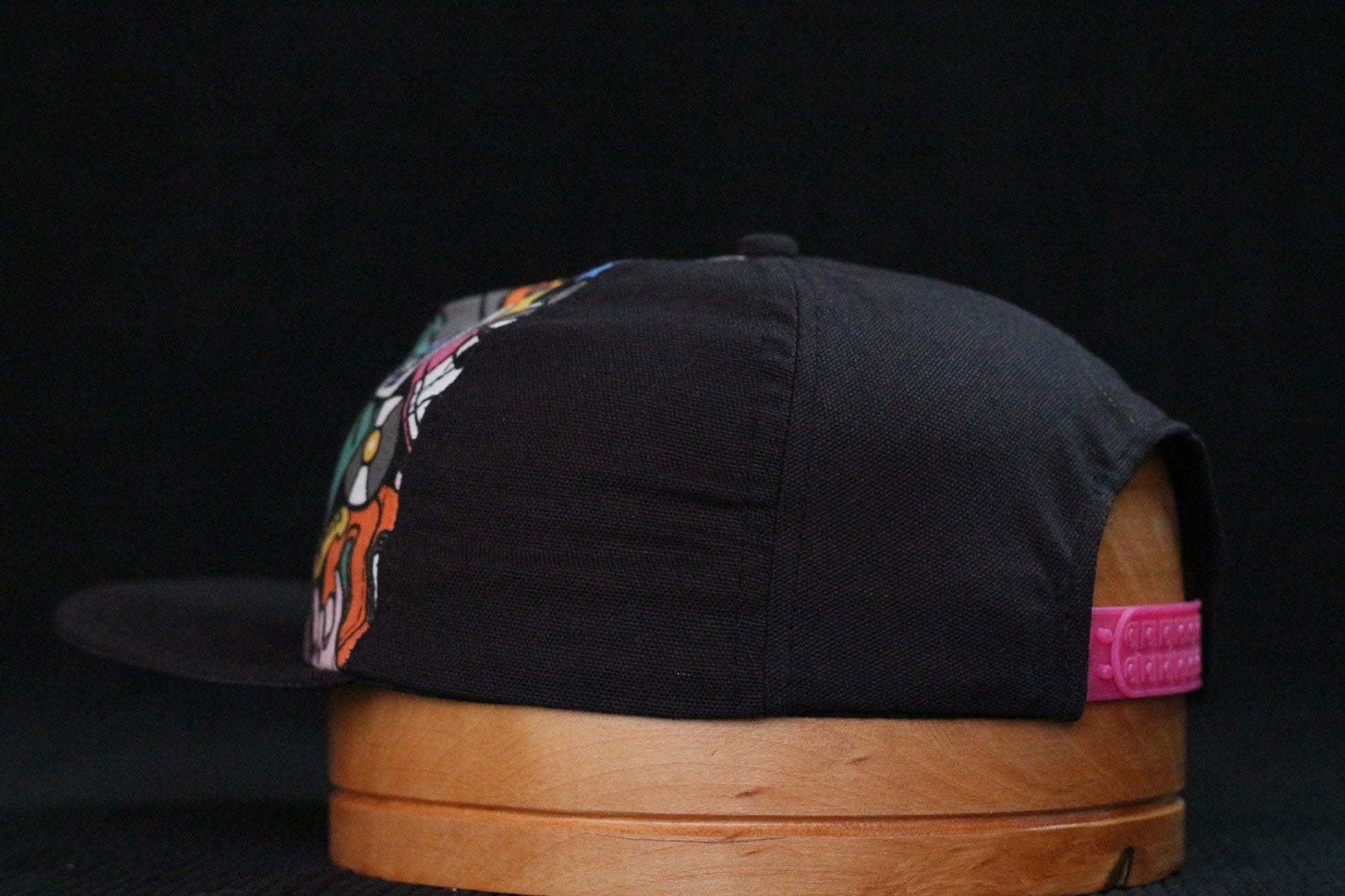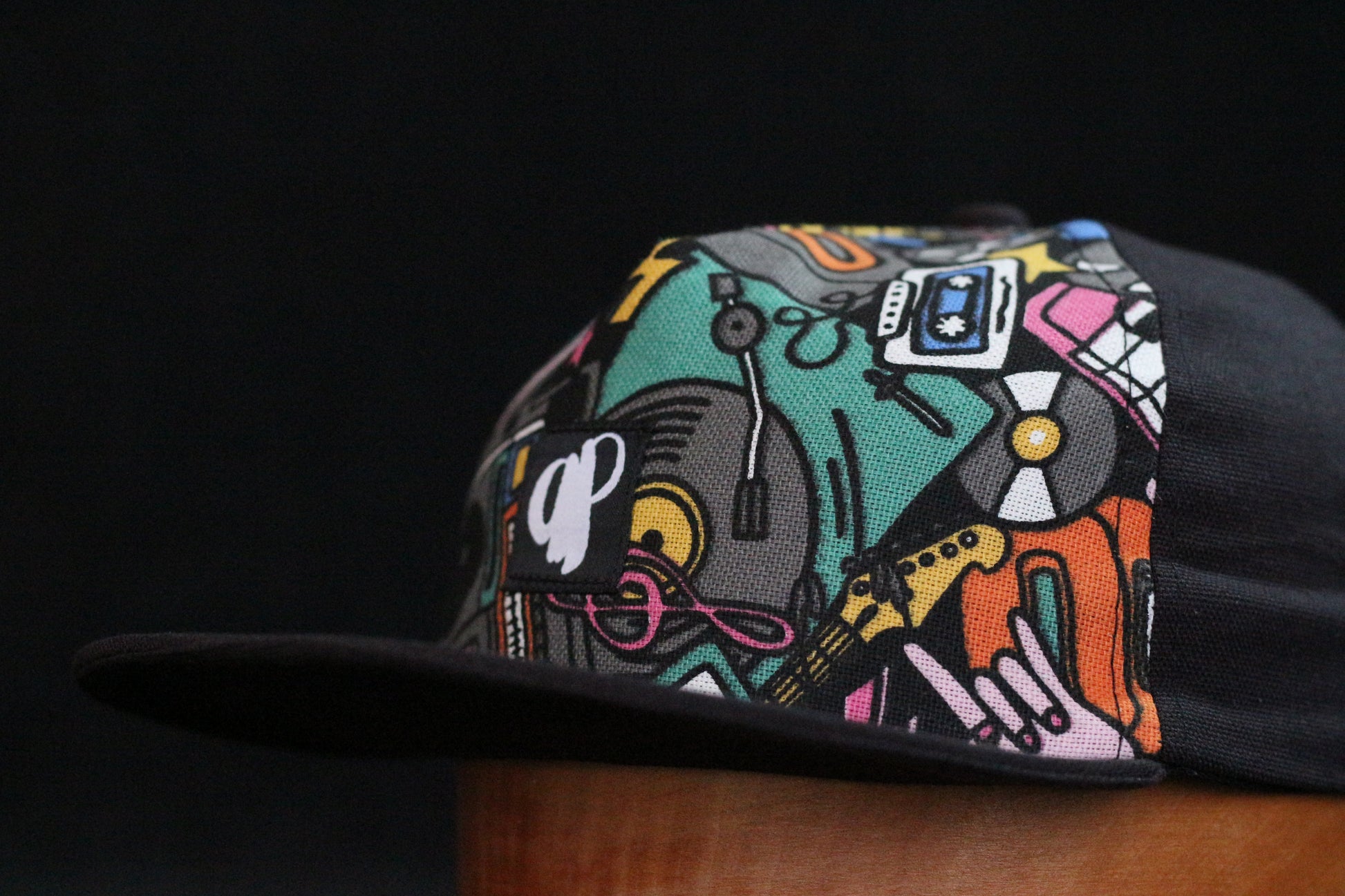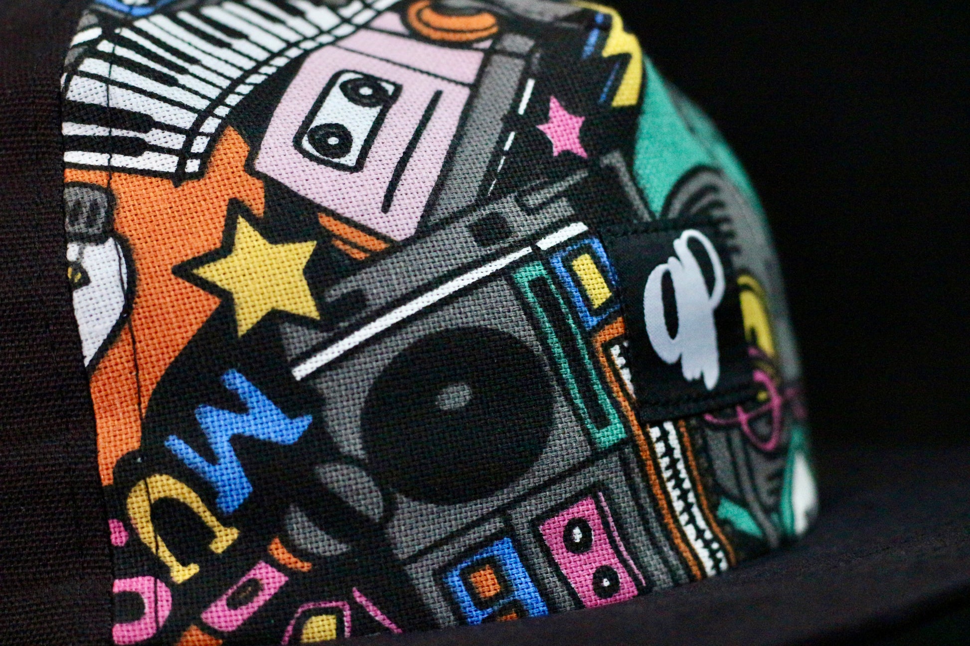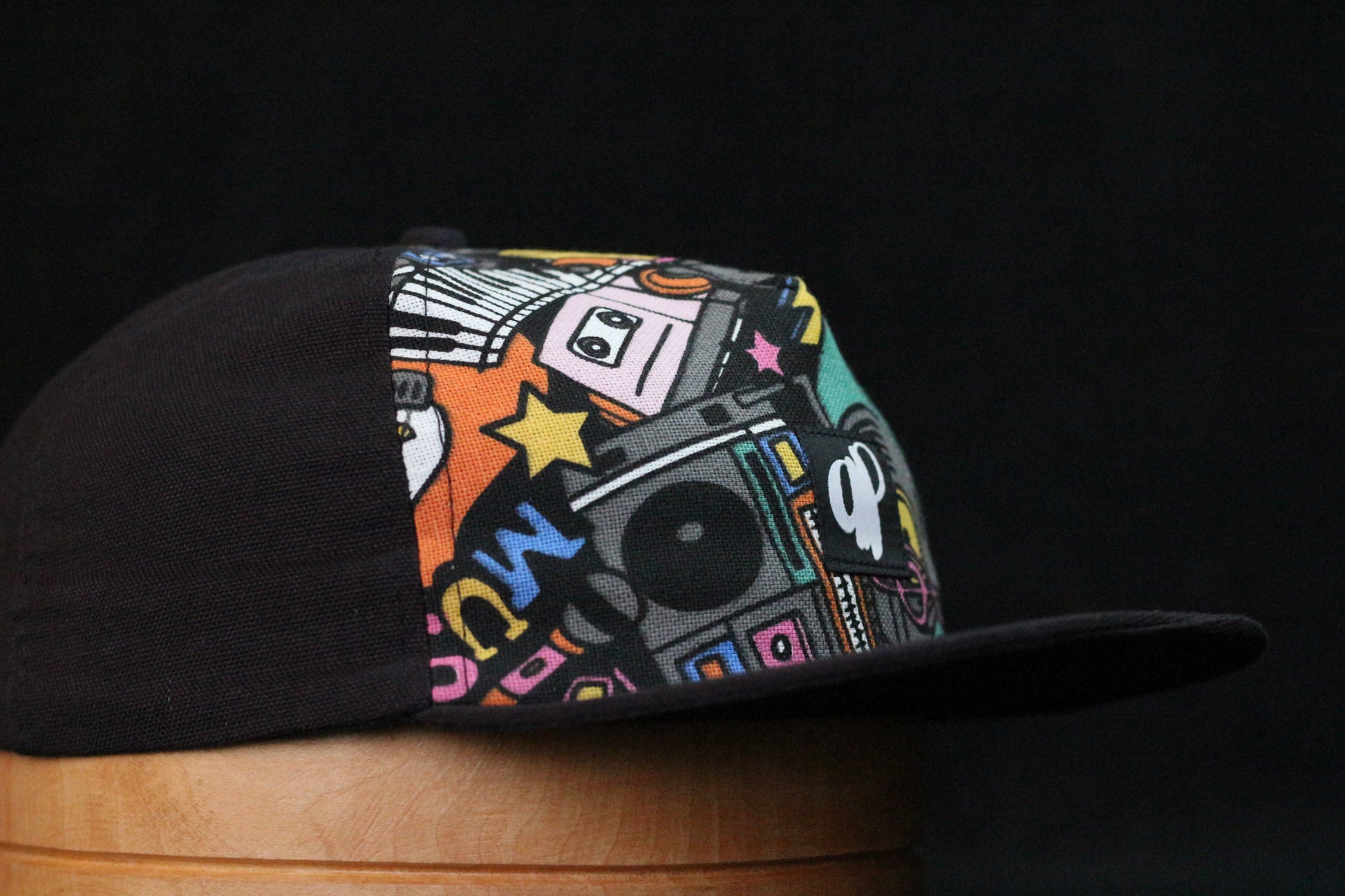 BLACK FUNKY FAMILY – Une casquette qui célèbre la musique et le style rétro. Son design 5 panels mêle un imprimé "music vibes" explosif sur la face avant à un coton noir premium à l'arrière, complété par des détails colorés et une fermeture snap rose vintage. Ajustable et confortable, elle transforme instantanément ton look avec une touche de groove intemporel. Chaque pièce est unique, les motifs variant selon la découpe du tissu.