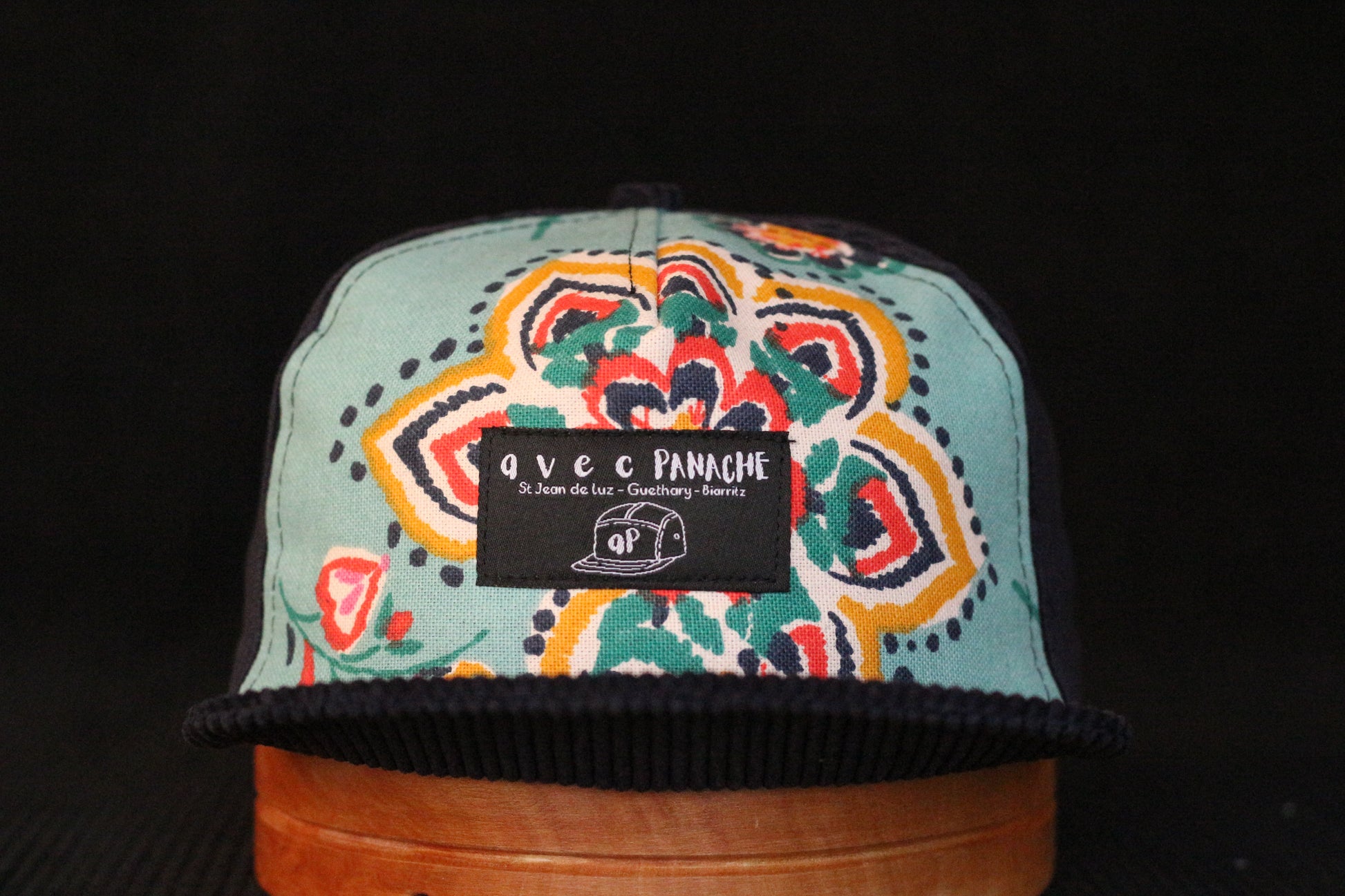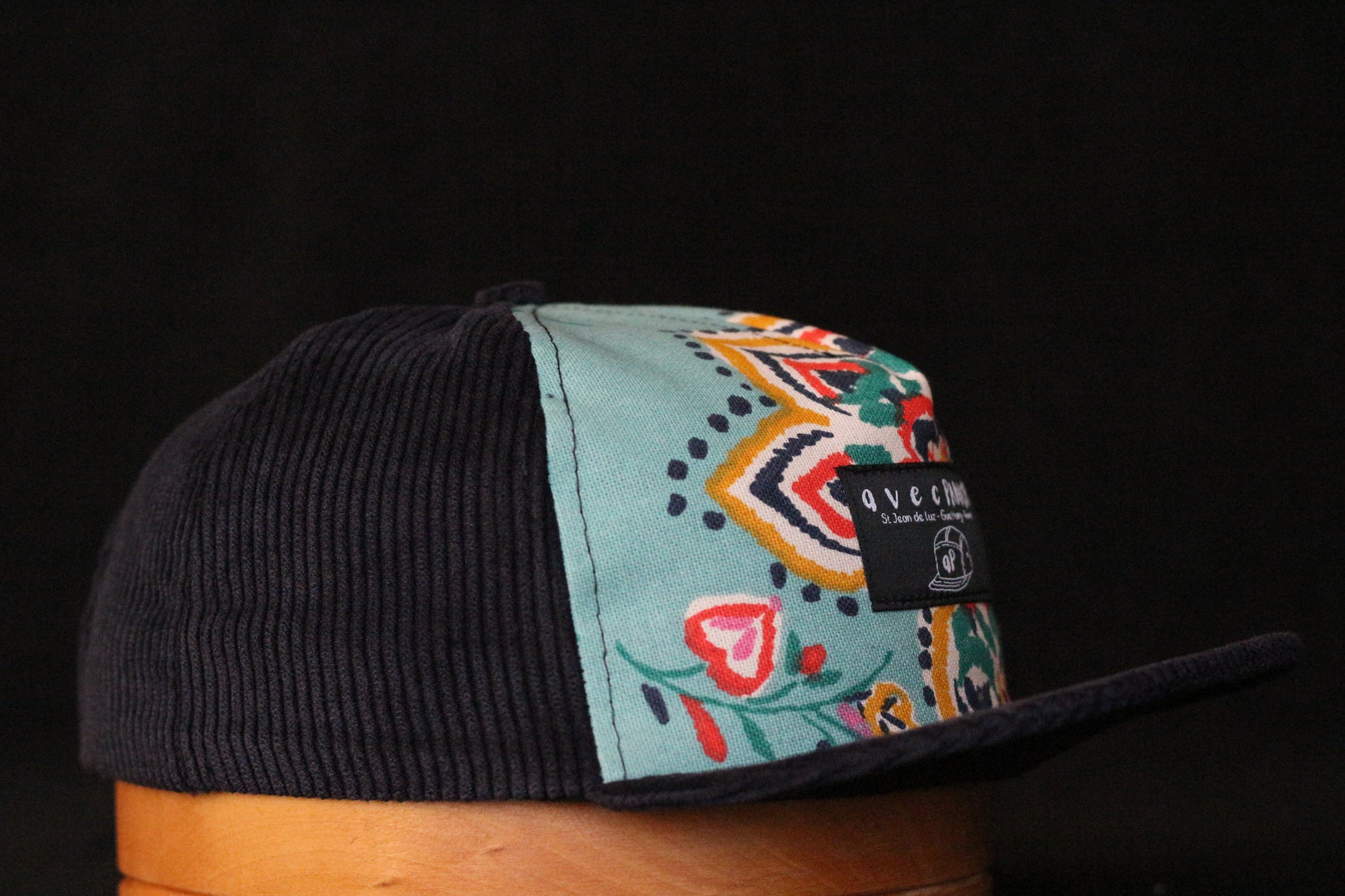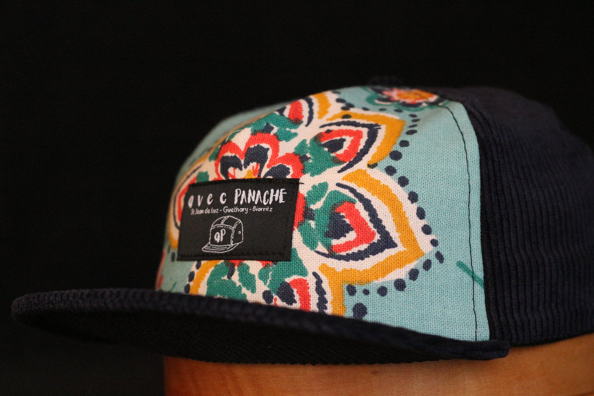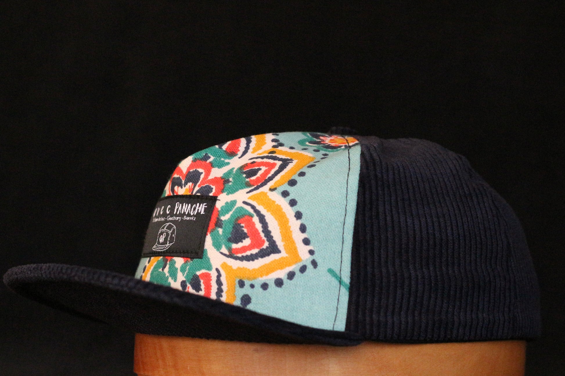 Une casquette qui donne le sourire. Son imprimé mandala coloré fait rimer énergie, style et soleil. La casquette Mandala Avec Panache mêle velours bleu côtelé et coton imprimé turquoise et rouge. Un design joyeux pour ceux qui aiment les looks frais, positifs et originaux.
