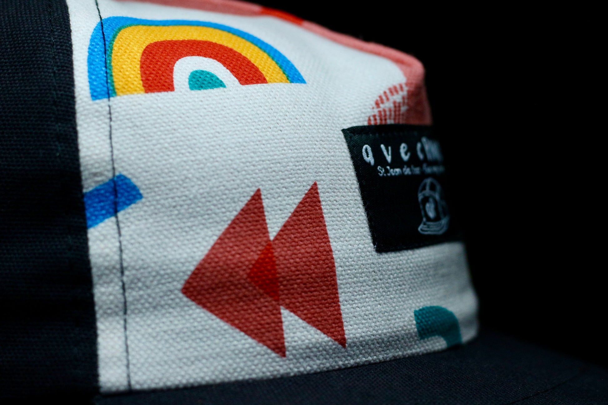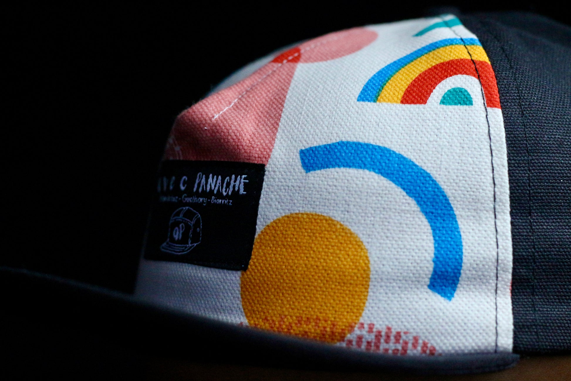 Casquette 5 panels ajustable SPACE COMMANDER IV BLACK avec tissu imprimé motifs rétro et couleurs pop. Panneaux latéraux en coton noir, étiquette signature "Avec Panache" (au choix). LégÚre et fun, chaque piÚce est unique avec des motifs qui varient selon la découpe du tissu.
